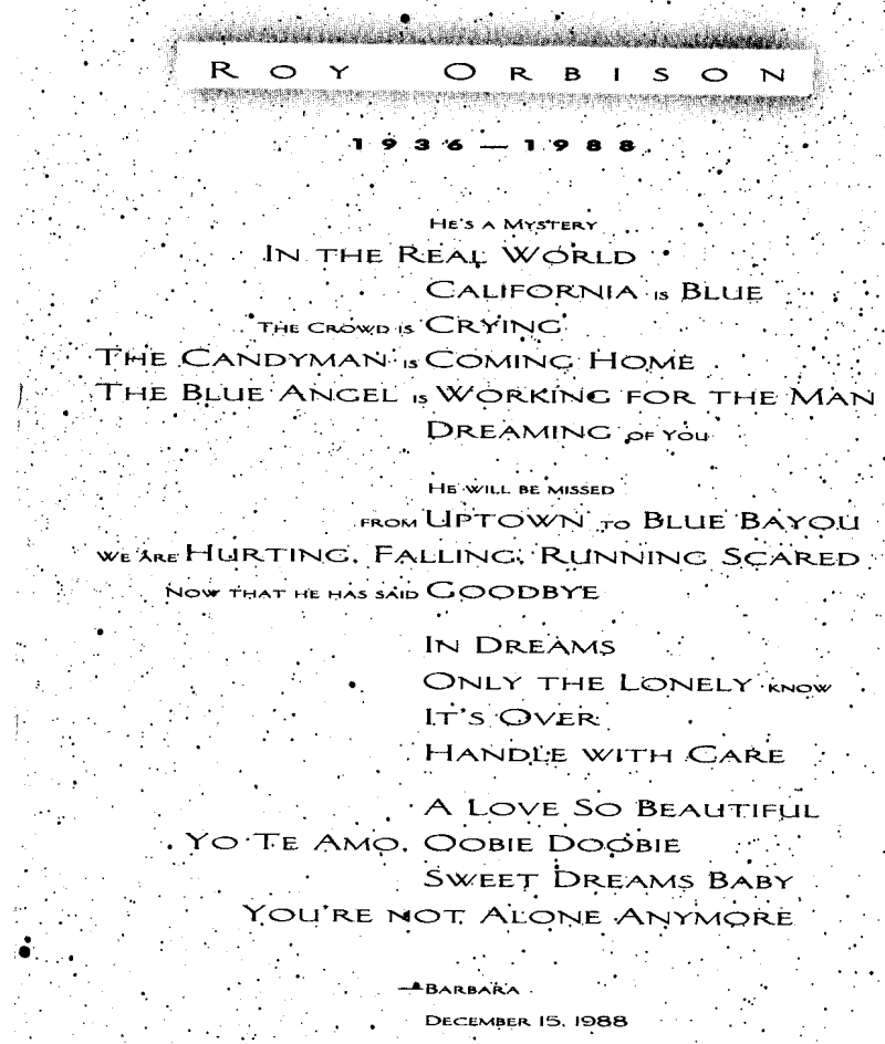 Na zijn dood sprak Paul McCartney over zijn vriend: “Roy Orbison was één van de grootste rock’n’roll sterren ter wereld en zal dat ook altijd blijven.(bron: NPO radio 2)